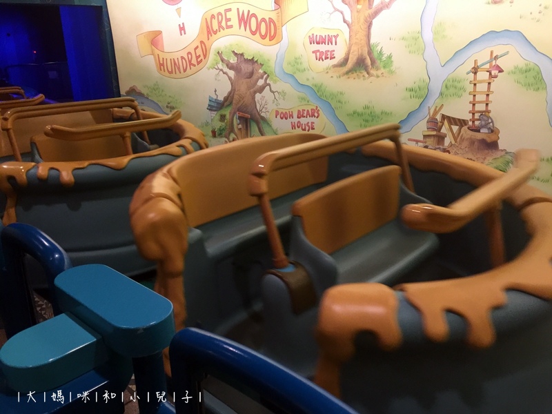 終於在天快黑的時候進入維尼噗的世界,所有東西都做得好精巧啊!小熊維尼獵蜜記是一個與眾不同的遊樂設之,搭乘蜂蜜罐在一個超大房間裡穿梭,一條軌道都沒有,跑得又快又順,理工科背景的夫婦倆忍不住一直探討是怎麼做到的?像掃地機器人的原理?還是在地板下面埋東西?答案在WIKI裡,竟然每次坐的路線都會不一樣!