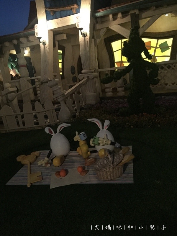 終於玩到了獵蜜記,去卡位看夜間遊行之前,要繞去把耳兔蛋的獎勵貼紙摘下!