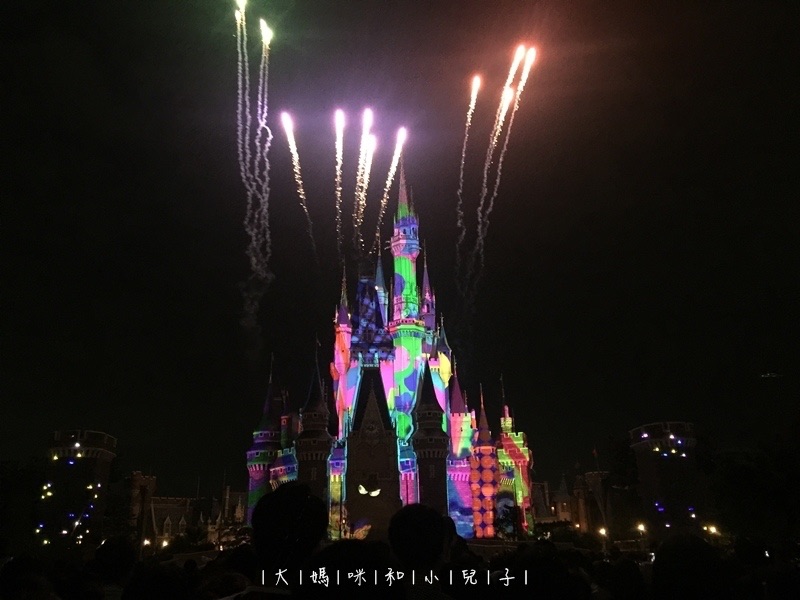 果然好精彩!這二天在樂園裡玩過的故事都上演了,把城堡當作超大畫布,用異常的想像力呈現,偶爾還會噴火、打幾發小煙火。