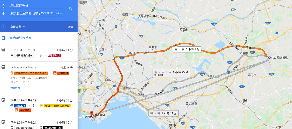 交通方式是搭電車,京城電鐵Access特快到東松戶再轉武藏野線,臭狗爸爸跟公公婆婆在新埔安站先下車,阿母我跟小人多搭一站到舞濱站進迪士尼,Google Map除了建議出較佳路線,連時間都能估計出來,所以不必太掙扎就可以捨棄貴鬆鬆的日木津巴士,反正花費的時間差不多,那就花點體力省點錢吧。