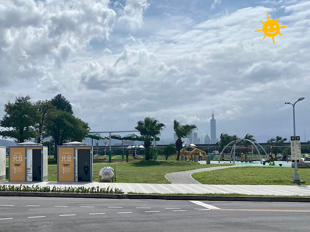 從基十六號水門進入河濱公園,一進來就能看到剛蓋好的兒童遊戲場,這幾年美堤河濱公園興建了很多實用場地與公廁,覺得非常棒,如果能有飲水機就更環保完美了。