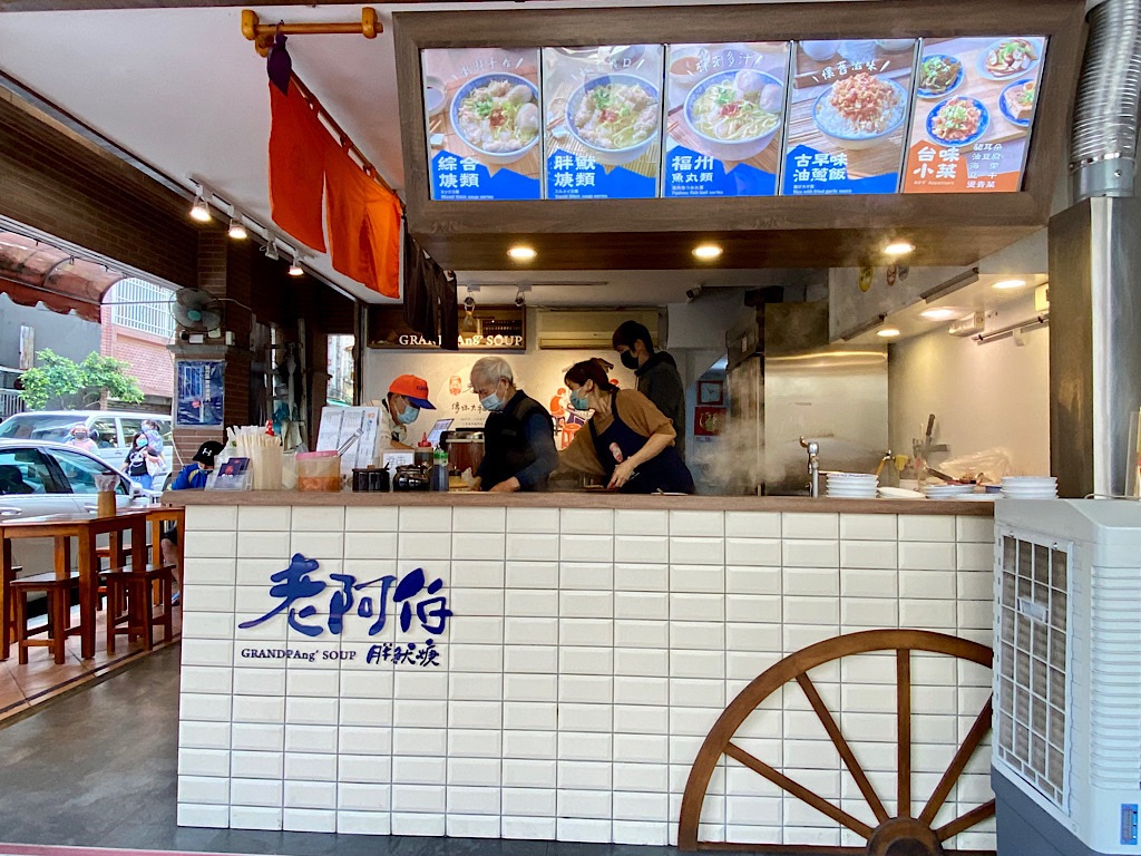 在大稻埕經營超過60年,現在由第三代接手的老店,採用了很巧妙的設計,(不知為何合法?)擺在騎樓的木桌椅,搭配店面廚房設計,完全保留了路邊攤的精神,但卻能有舒適的用餐環境。