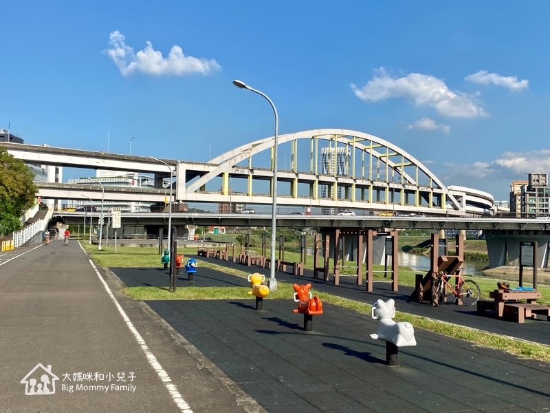 不得不佩服當初決定這個造型的勇氣,周遭建設了許多大人小孩的運動場,色彩也很鮮豔活潑,整體感受好歡樂喔!是既大佳河濱公園之後,覺得另一個超有朝氣活力的地方。