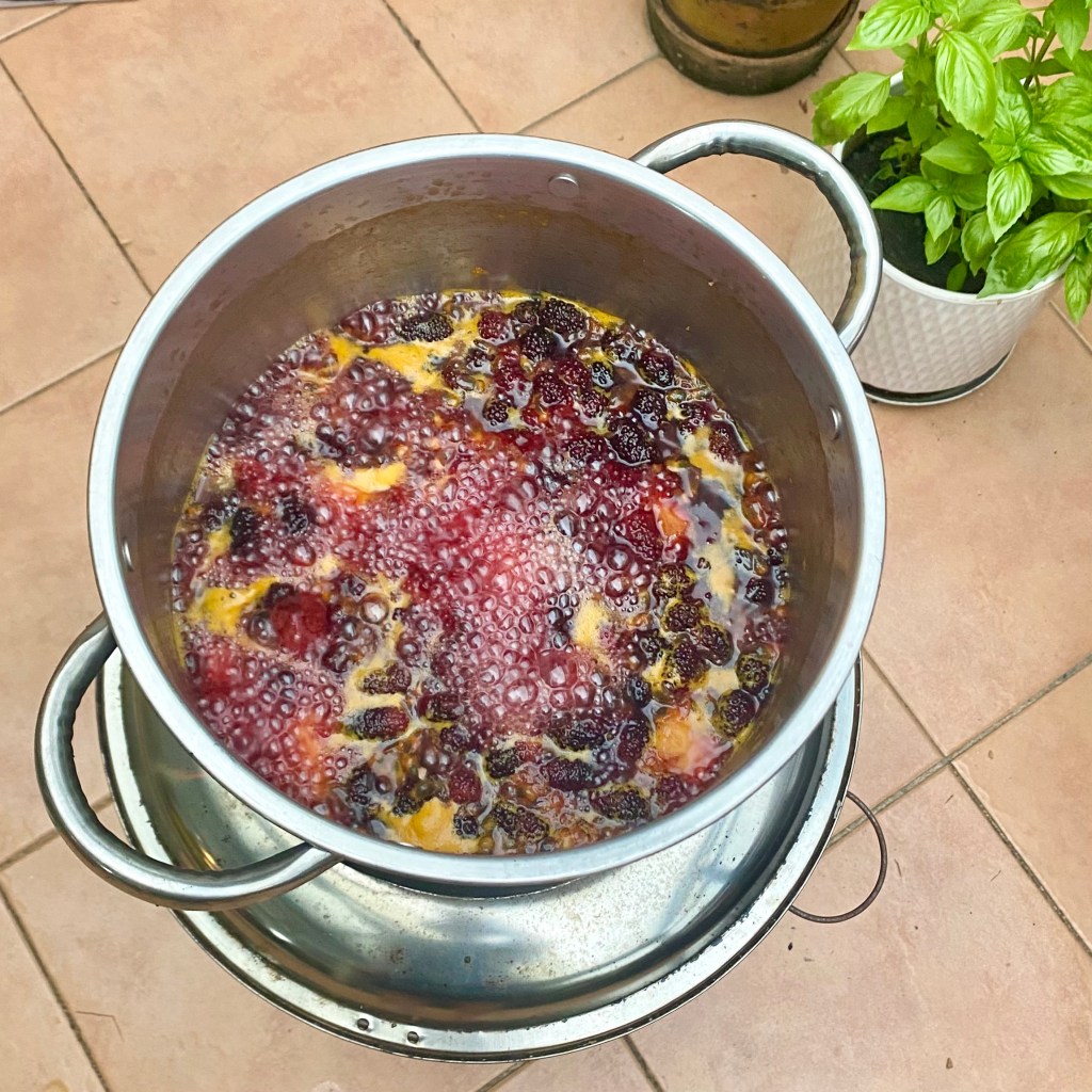 家門口的桑葚樹結實纍纍,蟲跟鳥都喜歡的軟甜果實,我們不常住都很難有機會採收,天時地利人合採收了一大碗,加上好多好多的糖,熬煮出桑葚糖漿特有的香氣,再加上一顆盛產期的香甜鳳梨,水果茶完成囉!煮過的鳳梨像罐頭口感好好吃!