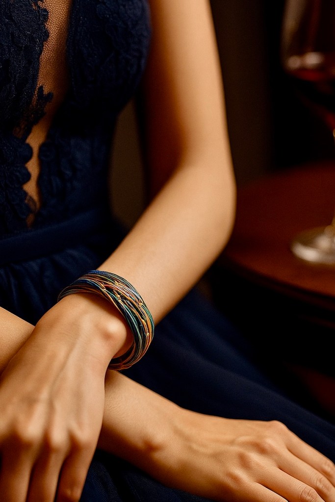 偶然在網路上看到由大量絲線組成的華麗設計,那種適合老外的金光閃閃,好看但要配戴還真不容易!想想何不來做一版我喜歡的多彩版本?於是「百色」就誕生了,將近百條蠟線,說真的收尾時還真不好控制,順利捲出漂亮的層次,好喜歡!
