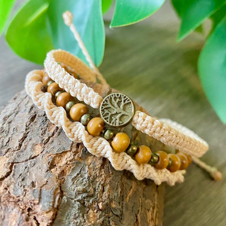 。飾品為木珠與古銅珠